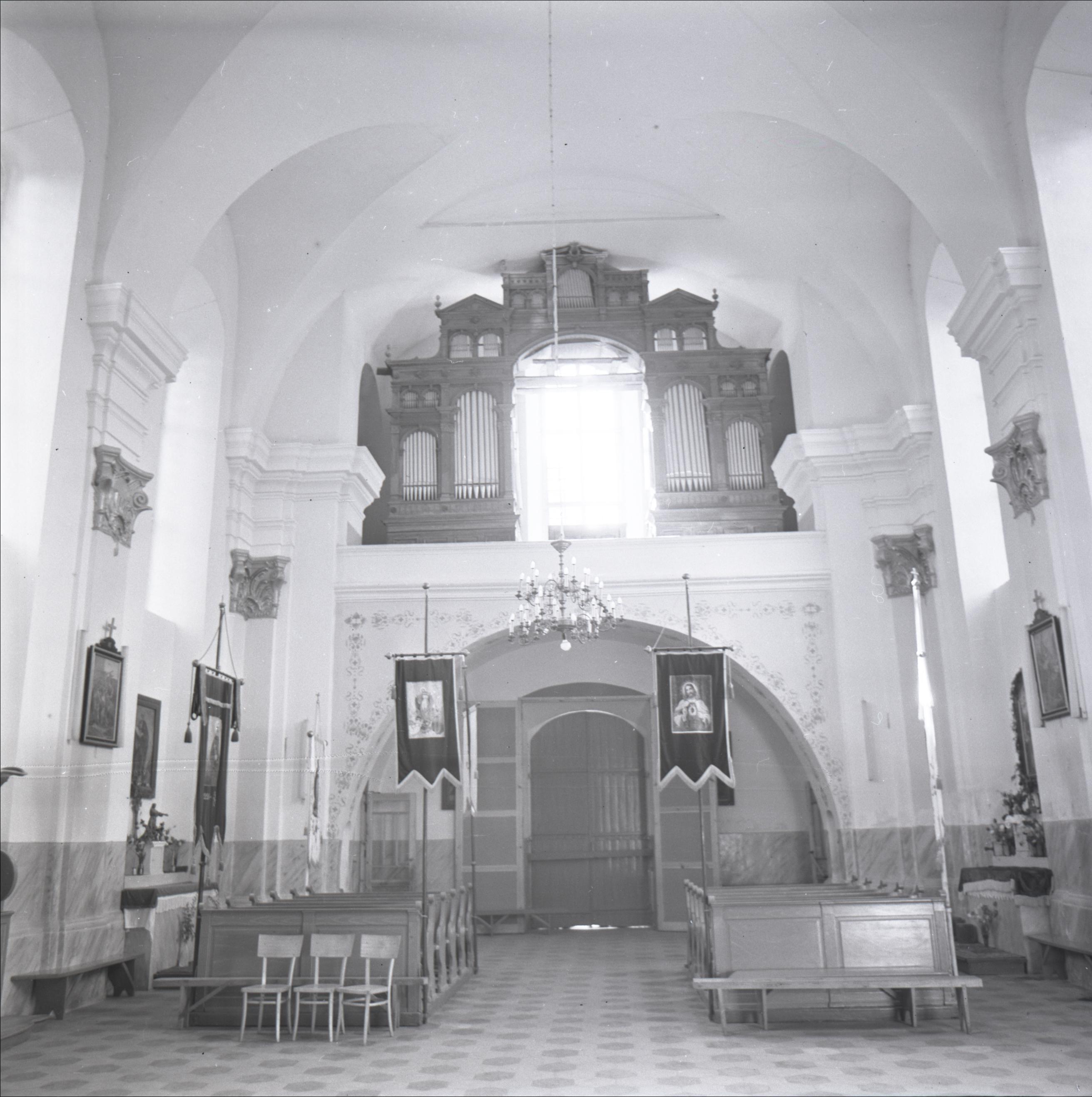 Sātu luterāņu baznīca ar žogu un vārtiem: Skats uz ērģelēm