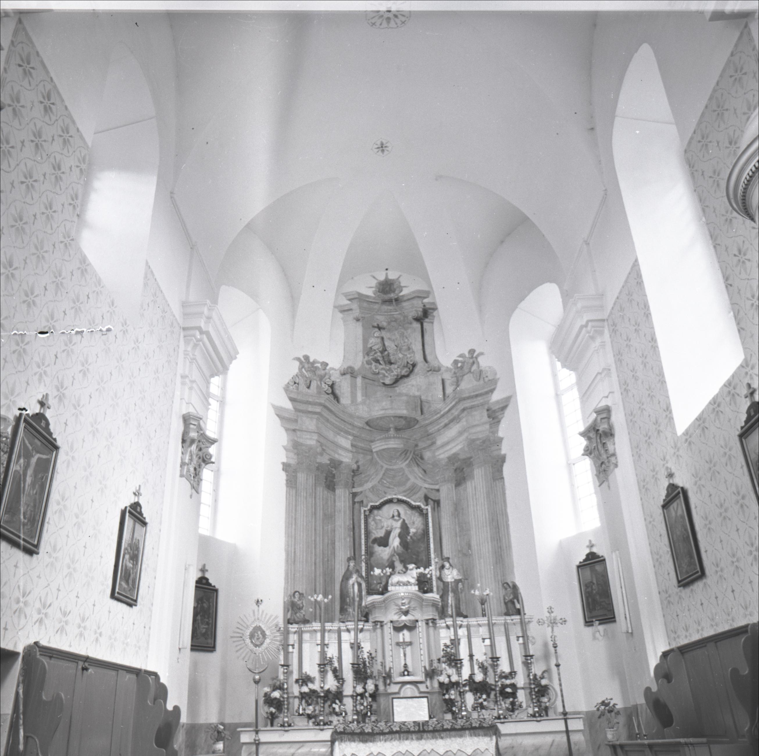 Piedrujas katoļu baznīca ar žogu un vārtiem: Skats uz altāri