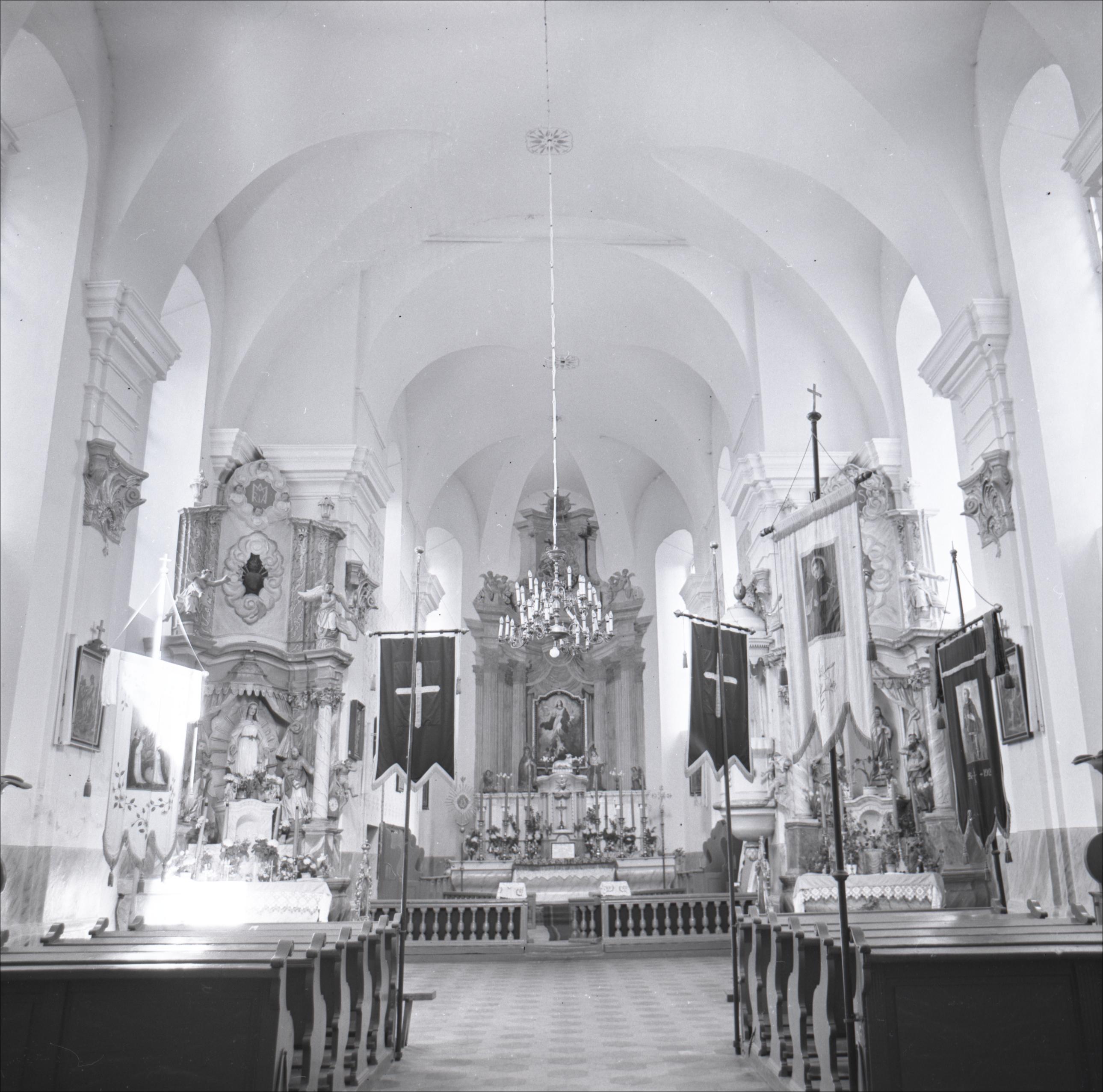 Piedrujas katoļu baznīca ar žogu un vārtiem: Skats uz altāri