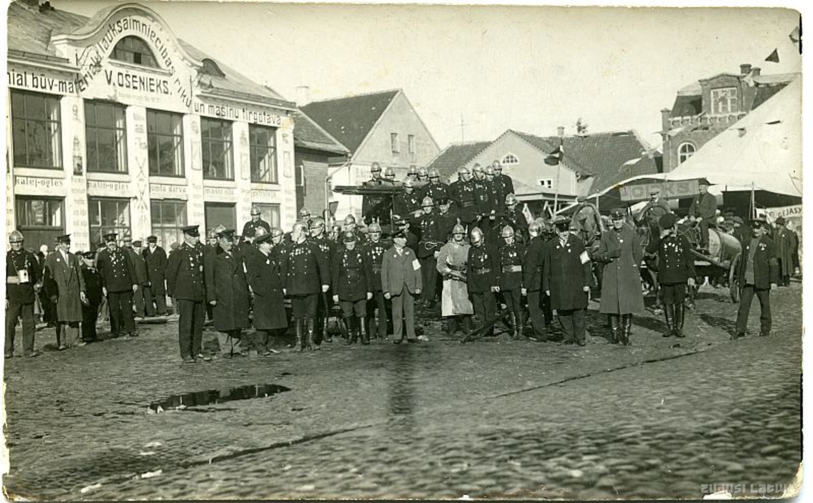 Bauskas Brīvprātīgo ugunsdzēsēju biedrības biedri pozē Tirgus laukumā. Daži ugunsdzēsēji uzkāpuši uz auto. Lai savāktu līdzekļus un iegādātos auto, BUB biedri 1920.gadu otrā pusē organizēja koncertus ar pieaicinātiem māksliniekiem, mantu loterijas, zaļumballes, ar biedrības orķestra piedalīšanos. 1930.gada 10.augustā ugunsdzēsēji varēja sarīkot jaunā auto kristības. Par godu ilggadīgajam biedrības priekšniekam Jurim Varenajam, jaunais auto tika nokristīts par „Juri”.