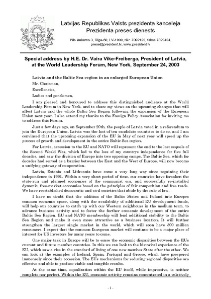 Special address by H.E. Dr. Vaira Vike-Freiberga, President of Latvia, at the World Leadership Forum, New York, September 24, 2003