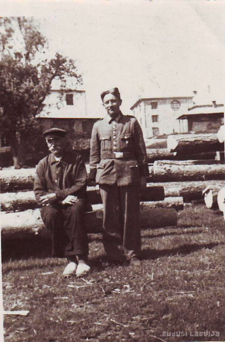 Kārlis Padedzis 1944 gadā Daugavas krastā pie Pļaviņu pārceltuves pirms došanās uz fronti. Fotogrāfijā redzams jaunais Vienības nams, tagadējais Pļaviņu kultūras nams