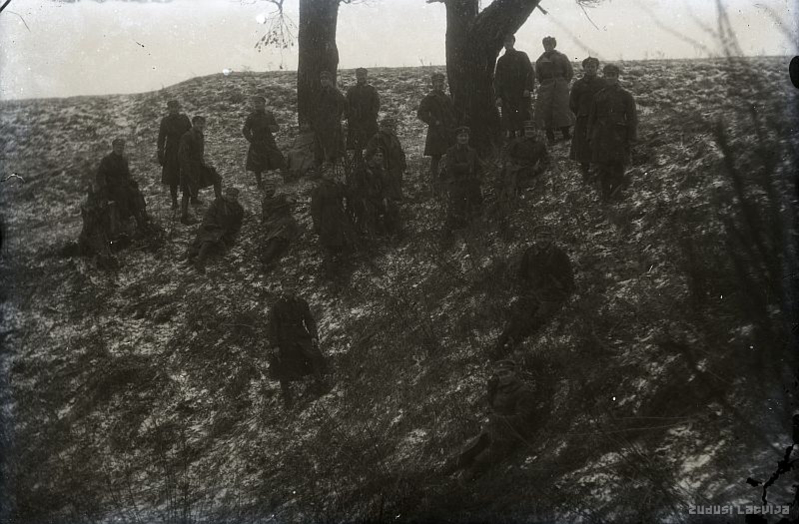 Latvijas armijas Zemgales artilērijas pulka karavīri ziemas formas tērpos sniegputenī uz Daugavpils cietokšņa vaļņa aptuveni 1920.-1921. gada ziemā