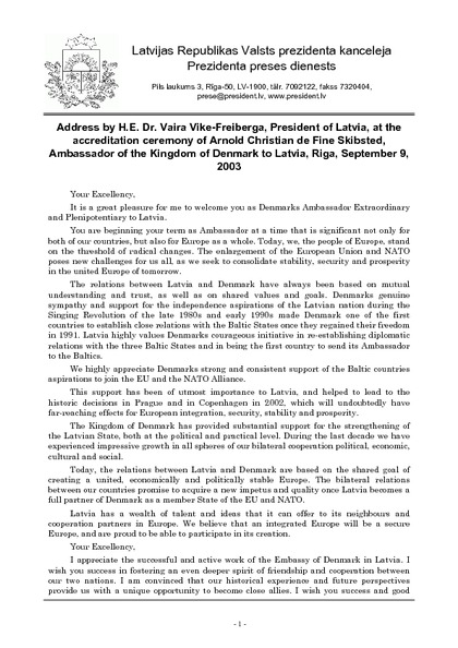 Address by H.E. Dr. Vaira Vike-Freiberga, President of Latvia, at the accreditation ceremony of Arnold Christian de Fine Skibsted, Ambassador of the Kingdom of Denmark to Latvia, Riga, September 9, 2003