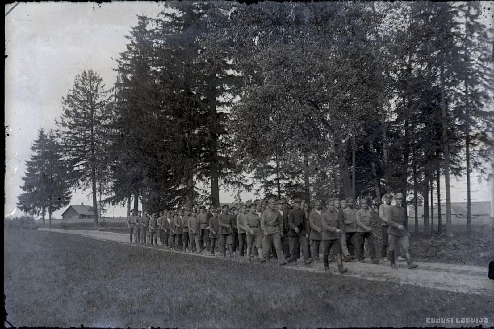 1.(4.) Valmieras kājinieku pulka Austrumu frontes rezerves bataljona (no 1919. gada augusta – 6. Rīgas kājinieku pulka 3. batalj.) karavīru kolonna dažādos formas tērpos, daļa bez apaviem, soļo pa lauku ceļu. Kolonnas priekšgalā soļo (no labās) 3. papildu rotas ( vēlāk 10. rotas) komandieris, virsleitnants Pēteris Ozoliņš (1894. - 1926.). 1919. gada jūnijs – augusts.