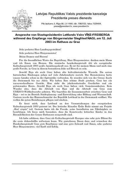 Ansprache von Staatspräsidentin Lettlands Vaira VĪĶE-FREIBERGA während des Empfangs von Bürgermeister Siegfried NAGL am 12. Juli 2003 im Rathaus zu Graz