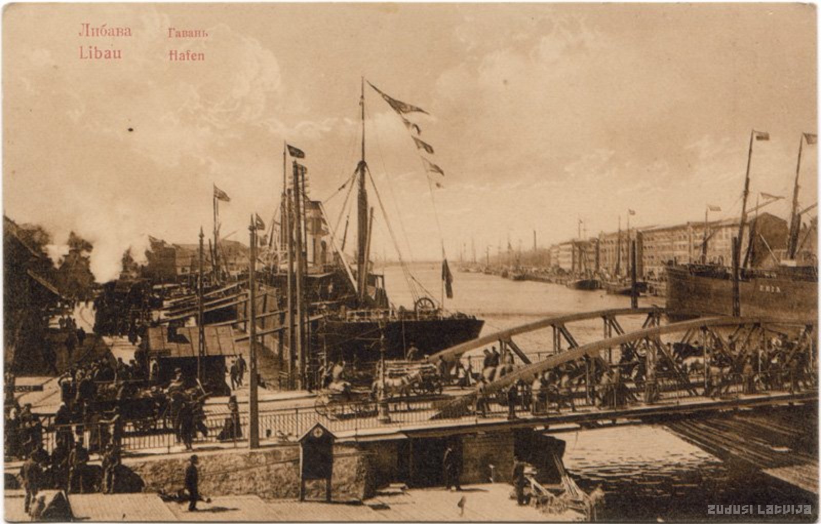 Liepājas osta 19. gadsimta beigās – 20. gadsimta sākumā. Osta laikā no 1890. līdz 1897. gadam tika izbūvēta par vienu no labākajām un lielākajām Krievijas impērijas ostām un bija trešā nozīmīgākā osta Baltijā tūlīt aiz Pēterburgas un Rīgas. Kopš 1906. gada uzturēja kuģu satiksmi arī ar Ņujorku, vēlāk arī ar Halifaksu, taču kara dēļ nepaspēja realizēt kuģu satiksmes atklāšanu ar Dienvidameriku. Priekšplānā tilts pār Tirdzniecības kanālu, kas savieno Liepājas ezeru ar jūru, kura krastos redzama ostmalas apbūve - noliktavas ar sarkanu dakstiņu jumtiem. Tiltu, kuram bija Beļģijā izgatavots griešanas mehānisms, atklāja un iesvētīja 1881. gadā. Tas savienoja Vecliepājas Lielo ielu ar Jaunliepājas Brīvības ielu un pastāvēja līdz pat 20. gadsimta 50. gadiem; kopš 1899. gada pa to kursēja elektriskais tramvajs. Kopš 1961. gada tā vietā atrodas jauns tilts. Ostmalas apbūve gāja bojā Otrā pasaules kara laikā. Pašlaik notiek Vecās Ostmalas labiekārtošana un rekonstrukcija.