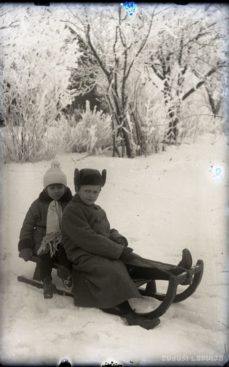Lazdonas pagasta Ceplinieku saimnieka Andreja Liepiņa bērni Harijs un Lucija uz tēva darinātajām ragavām ap 1930. gadu.