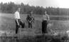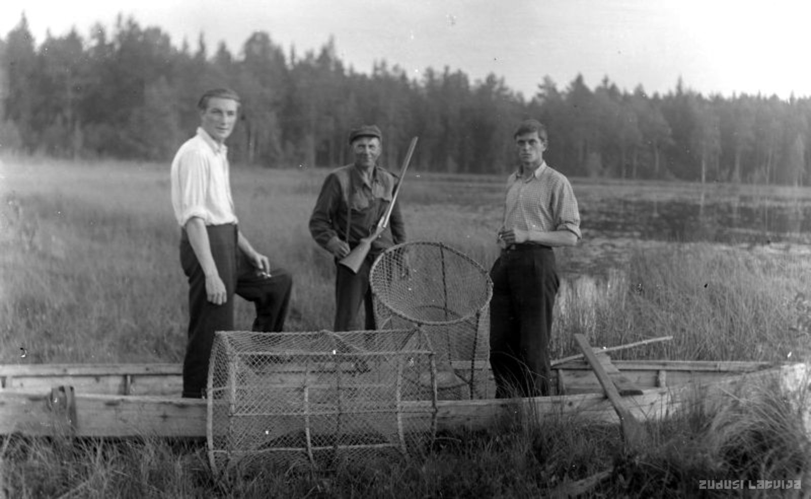 Trīs vīriešu portrets Madonas novada Lazdonas pagastā pie ezera ap 1952. gadu No labās puses pirmais stāv Harijs Liepiņš, no kreisās pirmais stāv Rolands Jaunbrālis.