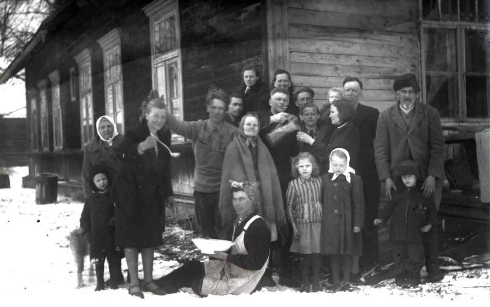 Madonas novada vienas mājas kaimiņu grupas portrets. Vidū ar seģeni Minna Liepiņa. Pirmais no labās puses ar ausaini Jānis Liepiņš.