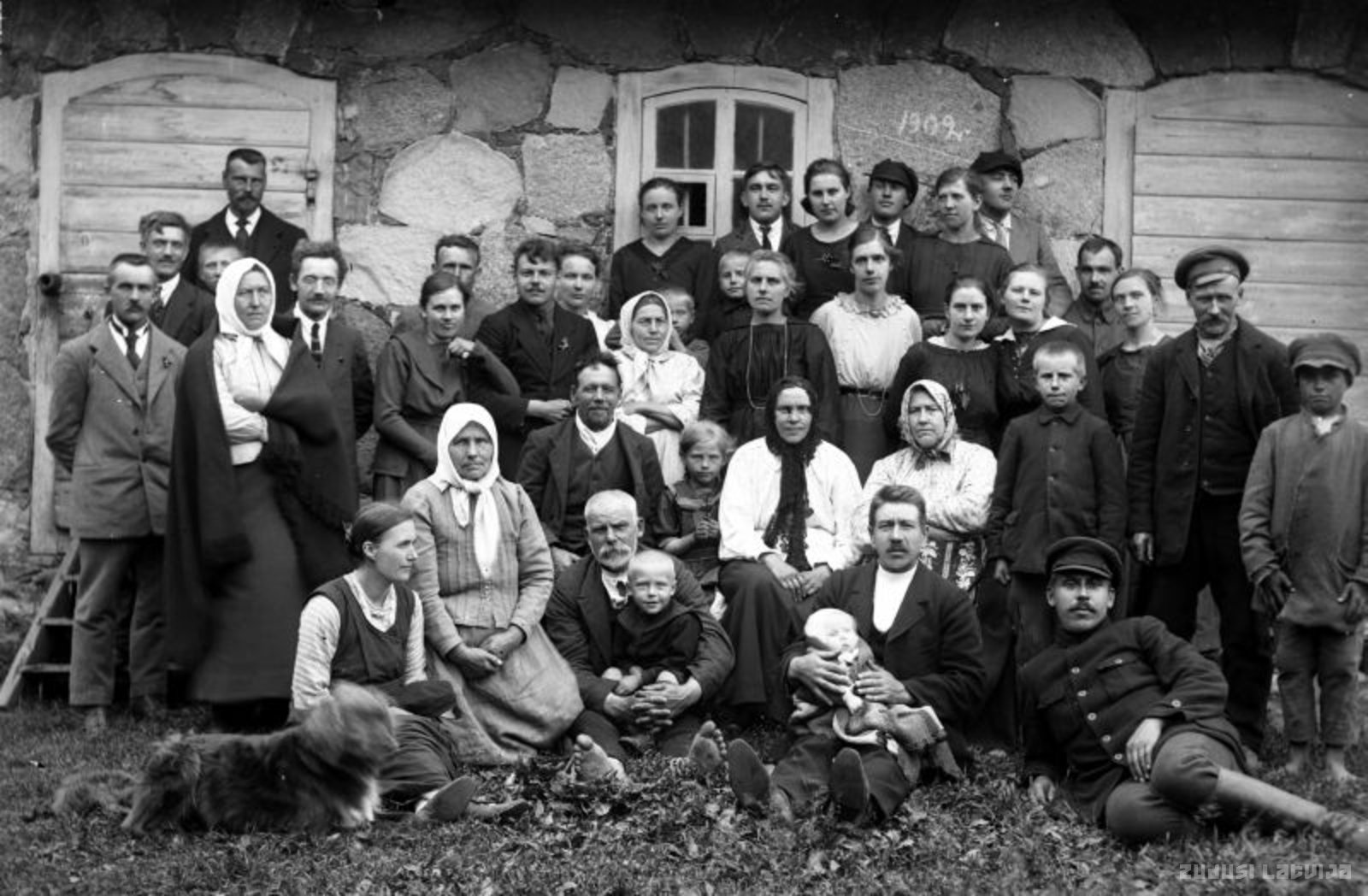 Madonas novada ļaudis ap 191-. gadu. Pirmajā rindā no labās pirmais guļ - Jānis Liepiņš. Pēdējā rindā pirmais no labās stāv Jānis Barbans, viņam blakus stāv Emma Liepiņa. No kreisās puses pēdējā rindā stāv Viktors Zeltiņš un viņam priekšā skolotājs Pēteris Liepiņš.