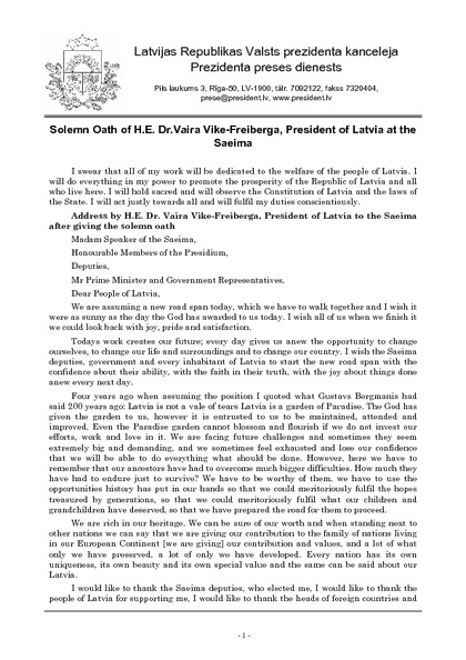 Solemn Oath of H.E. Dr.Vaira Vike-Freiberga, President of Latvia at the Saeima
