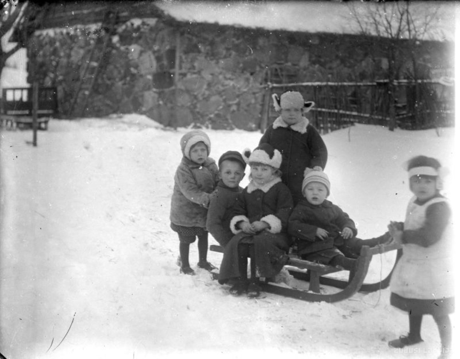 Madonas novada Lazdonas pagasta bērni ziemā uz ragaviņām ap 1930. gadu.