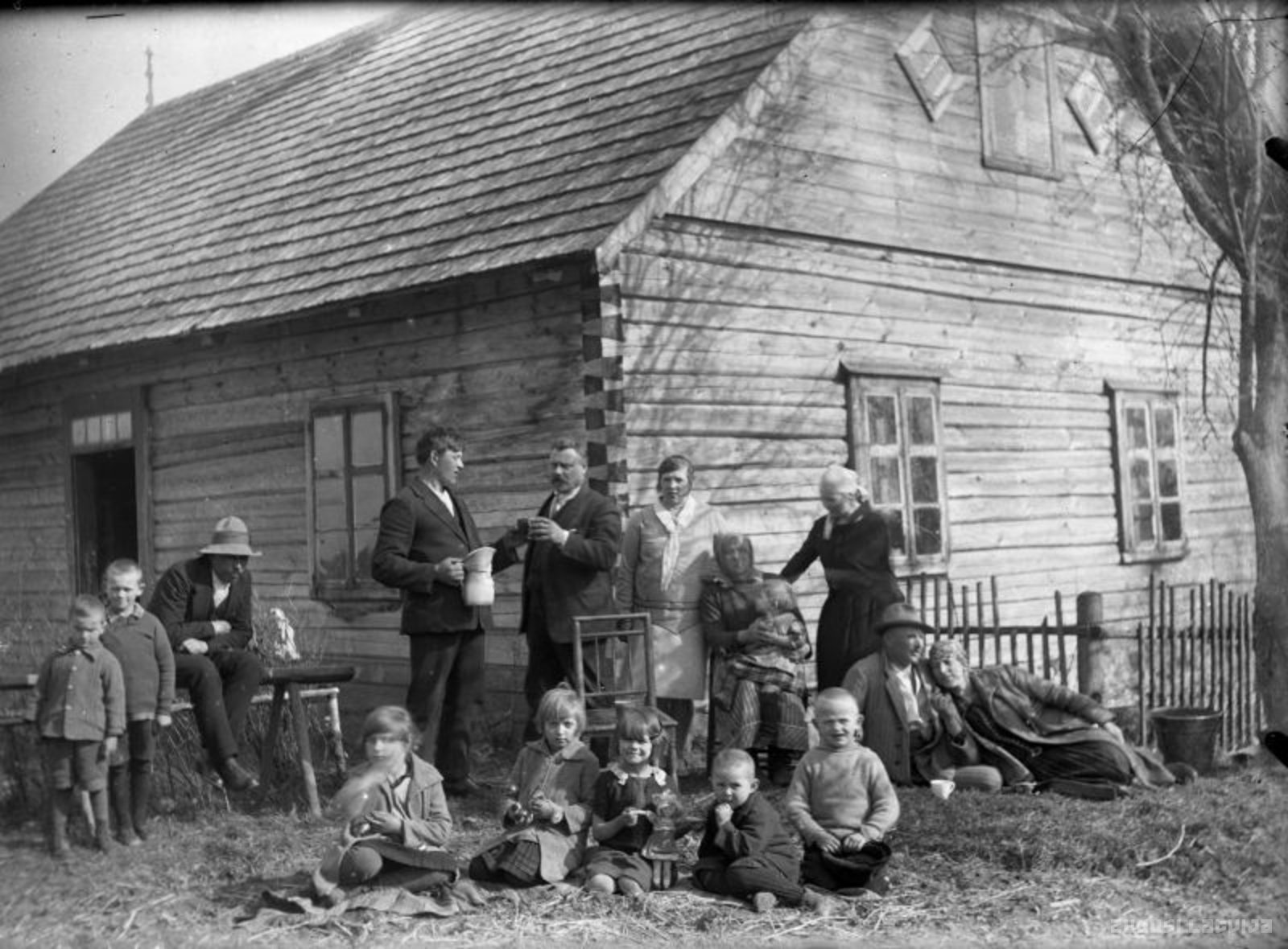 No kreisās puses pirmie - Marija un Pēteris Petrovski, tad Minna Liepiņa, Ieva Liepiņa tur klēpī mazbērnu; blakus stāv Emma Zeltiņa, viņai blakus stāv vīrs Viktors Zeltiņš un saskandina jaunbrūvēto alu ar Andreju Liepiņu.