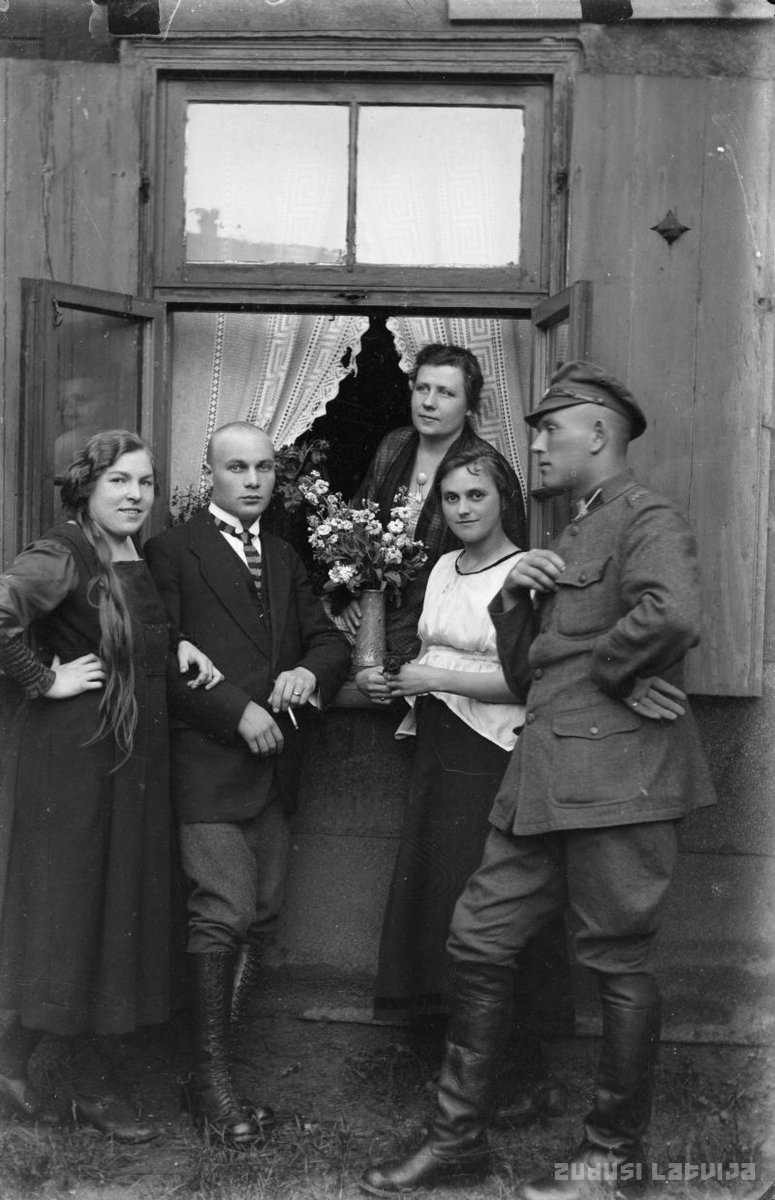 Zemgales Artilērijas pulka sakarnieks, seržants un fotogrāfs Andrejs Liepiņš ar izredzēto Elizabeti Ašamani (baltā blūzē) kopā ar draugiem Liepājā ap 1920. gadu.