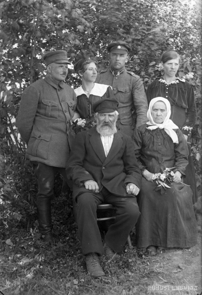 Madonas novada Lazdonas pagasta Ceplinieku māju saimnieks Mārtiņš Liepiņs (priekšplānā) ar sievu Ievu un bērniem - no labās puses - Emma, 6. Rīgas kājinieku pulka kaprālis un fotogrāfs Andrejs Liepiņš, Marija ar vīru Pēteri Petrovski. Foto tapis ap 1919. gadu.