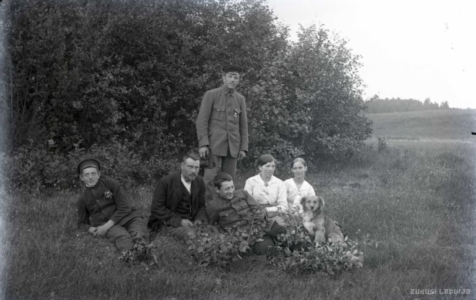 Stāv Brīvības cīņu dalībnieks 6. Rīgas kājinieku pulka kaprālis-sakarnieks un fotogrāfs Andrejs Liepiņš. Sēž otrais no kreisās Viktors Zeltiņš, viņam blakus Andrejs Barbans un Emma Liepiņa. Foto tapis ap 1919. gadu.