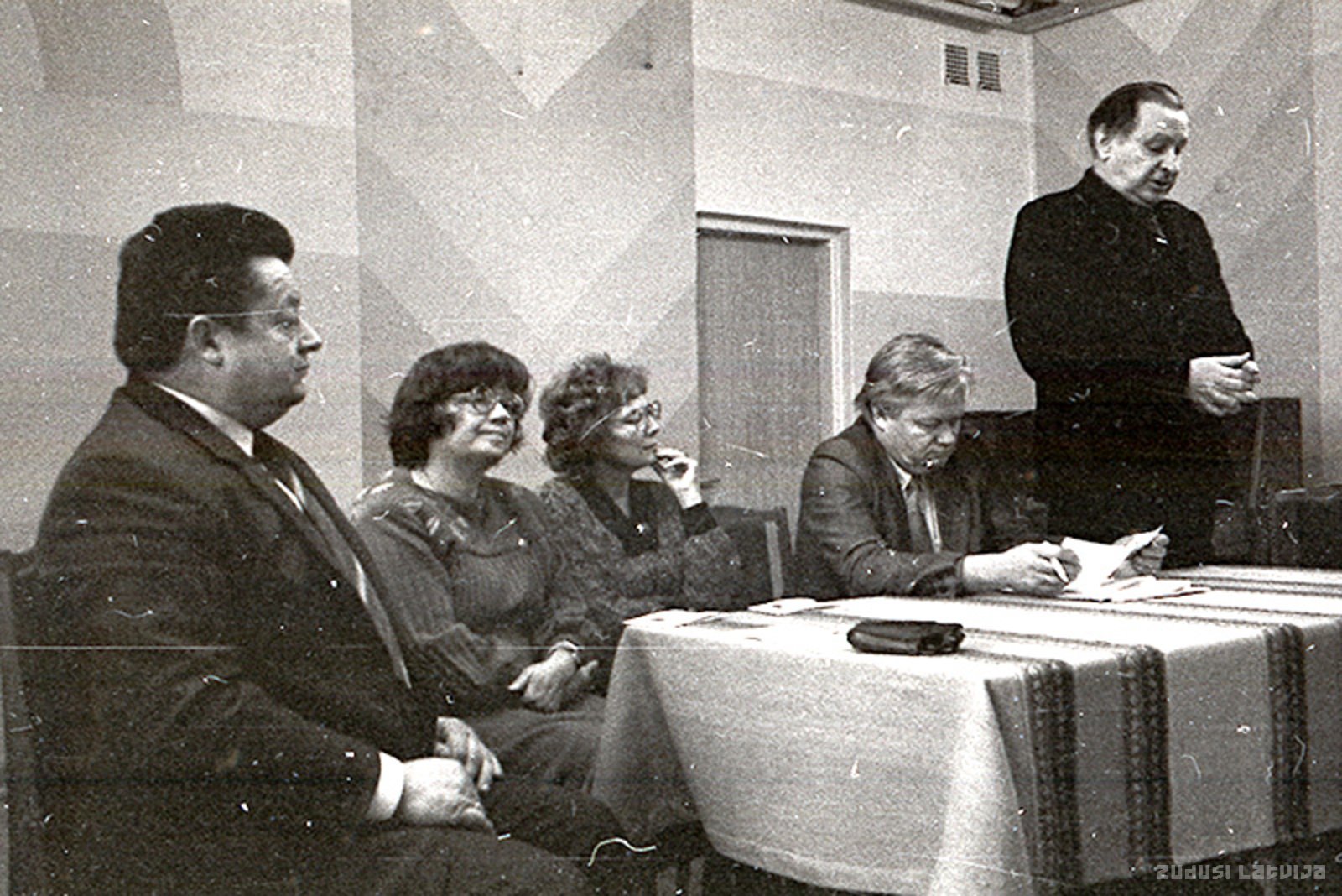 No kreisās: kolhoza "Kaugurieši" priekšsēdētājs Gunārs Freimanis, izdevniecības “Liesma” oriģinālprozas redakcijas vadītāja Vija Jugāne, vecākā redaktore Vija Kaņepe un galvenais redaktors Uldis Norietis, runā LLA profesors Ervins Grinovskis.