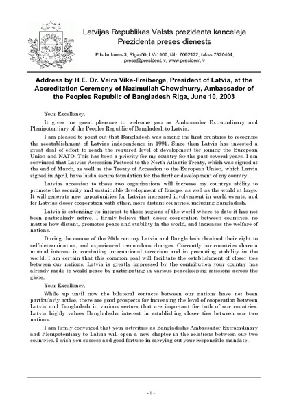 Address by H.E. Dr. Vaira Vike-Freiberga, President of Latvia, at the Accreditation Ceremony of Nazimullah Chowdhurry, Ambassador of the Peoples Republic of Bangladesh Riga, June 10, 2003