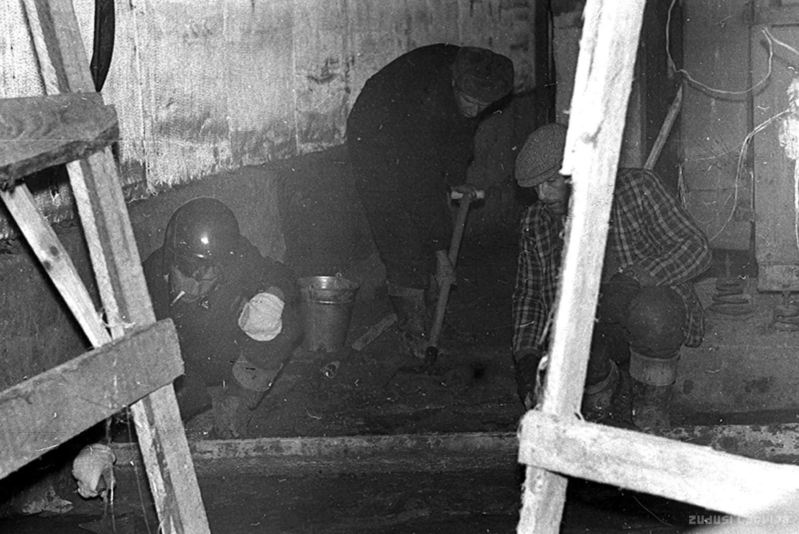 Lai pabeigtu slimnīcas būvi ieplānotajā laikā, tika piesaistīts papildu darbaspēks no lauku rajoniem. Kā padomju varas laikā tas bija raksturīgi, šādi pasākumi nereti notika zem "civilās aizsardzības mācību" izkārtnes. Attēlā: CA "mācību" dalībnieki no Valmieras rajona Kauguru pagasta (toreiz kolhoza "Kaugurieši") Gaiļezerā.
