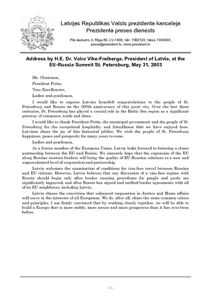 Address by H.E. Dr. Vaira Vike-Freiberga, President of Latvia, at the EU-Russia Summit St. Petersburg, May 31, 2003