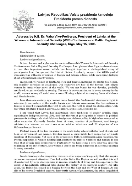 Address by H.E. Dr. Vaira Vike-Freiberga, President of Latvia, at the Women In International Security (WIIS) Conference on Baltic Regional Security Challenges, Riga, May 15, 2003