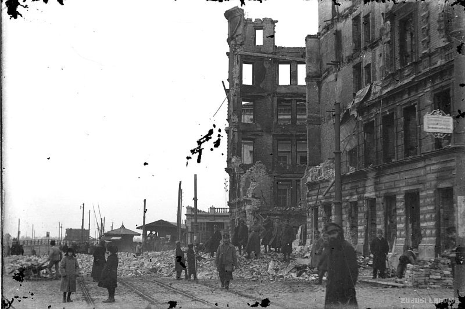 Skats uz Rīgas krastmalas ēku drupām pēc Rietumu brīvprātīgo (Bermonta) armijas sakāves 1919. gads.