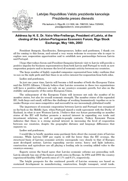 Address by H. E. Dr. Vaira Vike-Freiberga, President of Latvia, at the closing of the Latvian-Portuguese Economic Forum, Riga Stock Exchange, May 14th, 2003