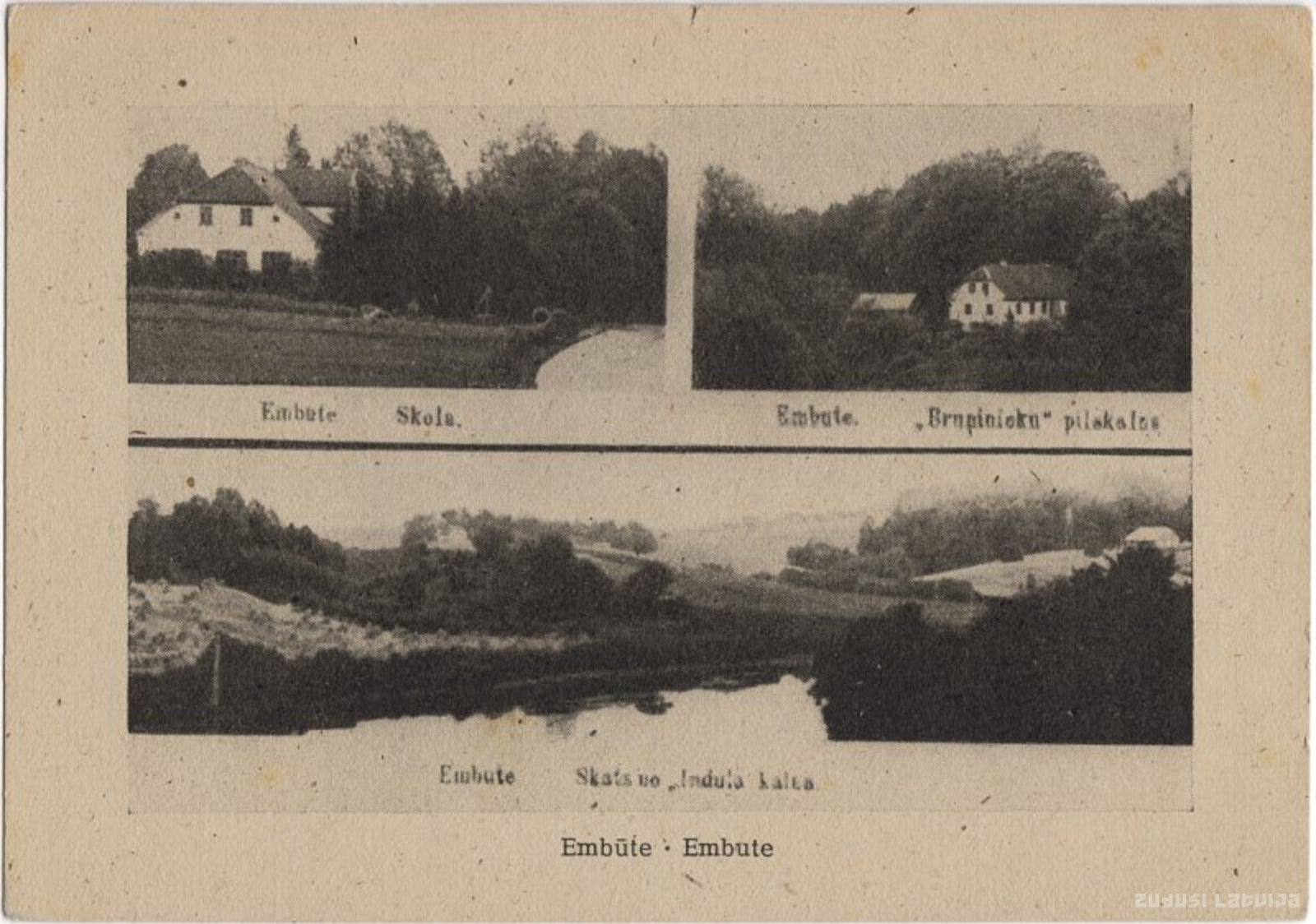 Embūtes kolāžā apvienotas trīs fotogrāfijas: Skolas ēka, Bruņinieku pilskans, skats no Induļa kalna jeb Embūte pilskalna