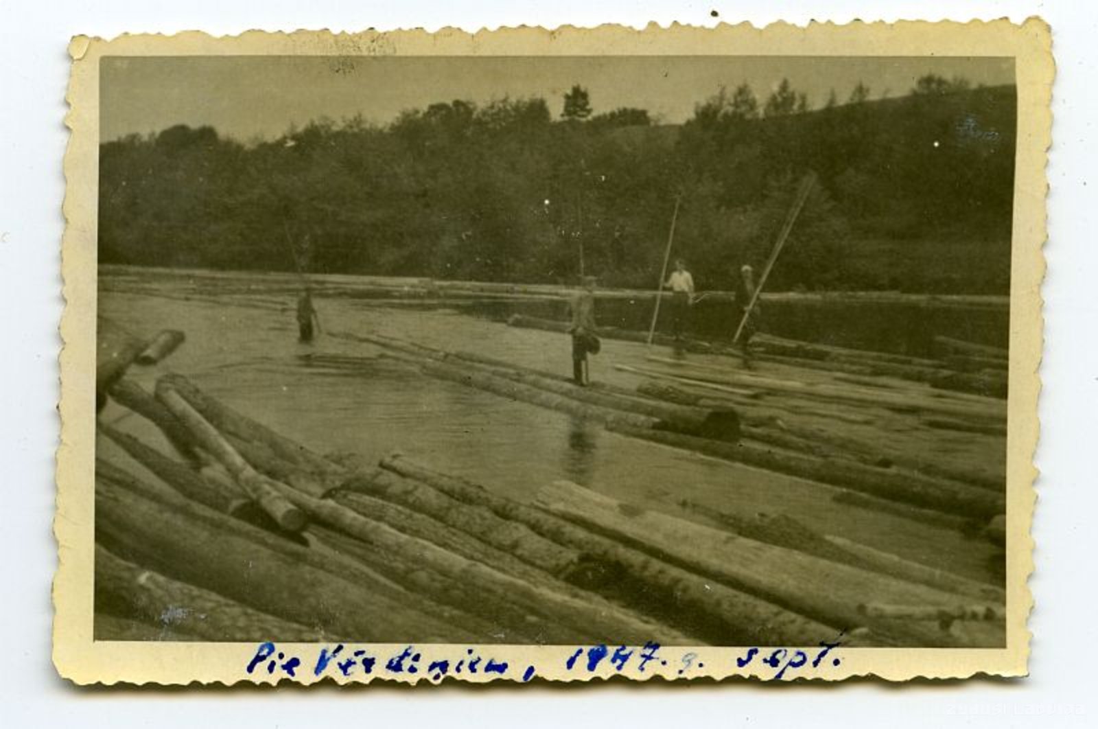 Kokmateriālu pludināšana Mēmeles upē aiz Skaistkalnes pie Vērdiņiem. Pludināšana beigta 20. gadsimat 60. gados