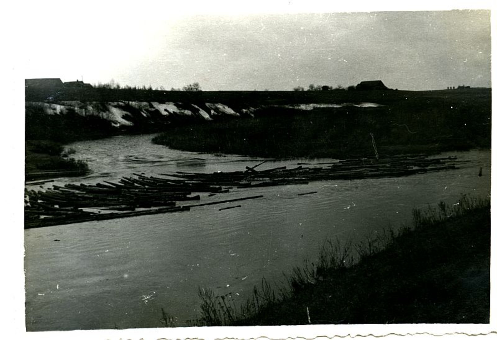 Kokmateriālu pludināšana Mēmeles upē pie Deviņzares salas pirms Ānes-Mēmeles muižas