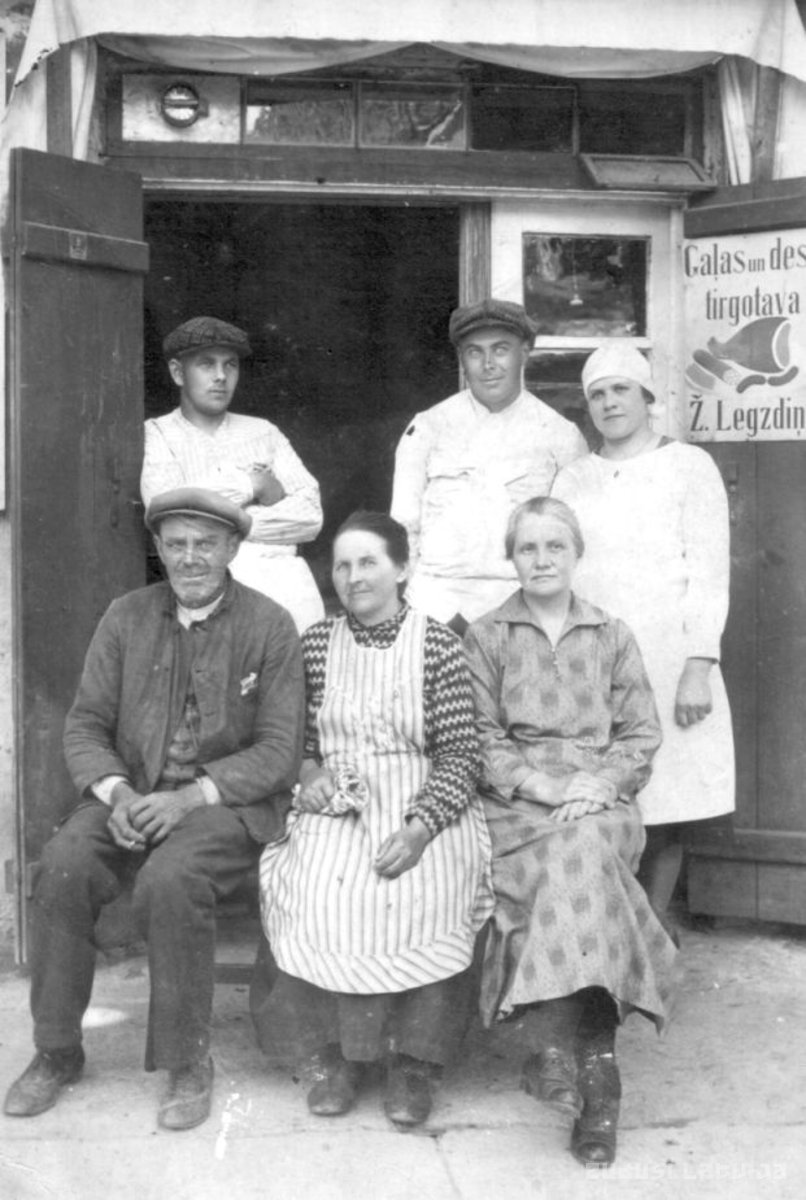 Talsi. Tirgotāja Žaņa Legzdiņa ģimene uz veikala lieveņa