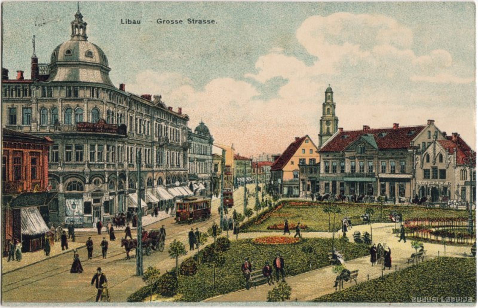 Liepāja – Lielā iela pie Rožu laukuma (izveidots 1910. gadā) 20. gadsimta sākumā. Iela vairākkārt pārdēvēta sakarā ar varas maiņām Latvijas teritorijā. 1797. gada Liepājas plānā tā tiek saukta par Grosse Straße, tās turpinājums - par Kauf Straße. 1893. gada Liepājas Latviešu kalendārā, kur pirmo reizi ir minēti ielu latviskie nosaukumi, tā ir latviskoti dēvēta par Lielo ielu (ielas turpinājums - par Tirgoņu ielu). Kopš 1899. gada pa šīm ielām kursē elektriskais tramvajs. No 1955. gada šīs abas viena otrai sekojošās ielas tiek pārdēvētas par Ļeņina ielu. Mūsdienās tās ir atguvušas savus latviskos Lielās un Tirgoņu ielas nosaukumus