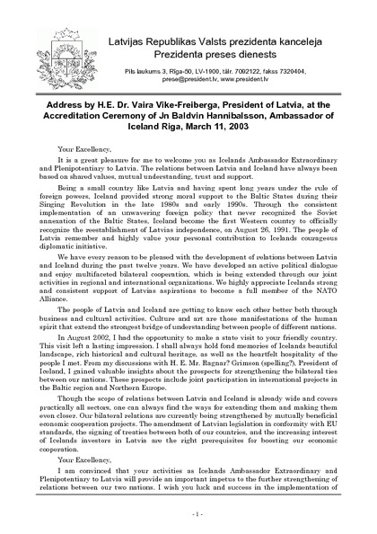 Address by H.E. Dr. Vaira Vike-Freiberga, President of Latvia, at the Accreditation Ceremony of Jn Baldvin Hannibalsson, Ambassador of Iceland Riga, March 11, 2003