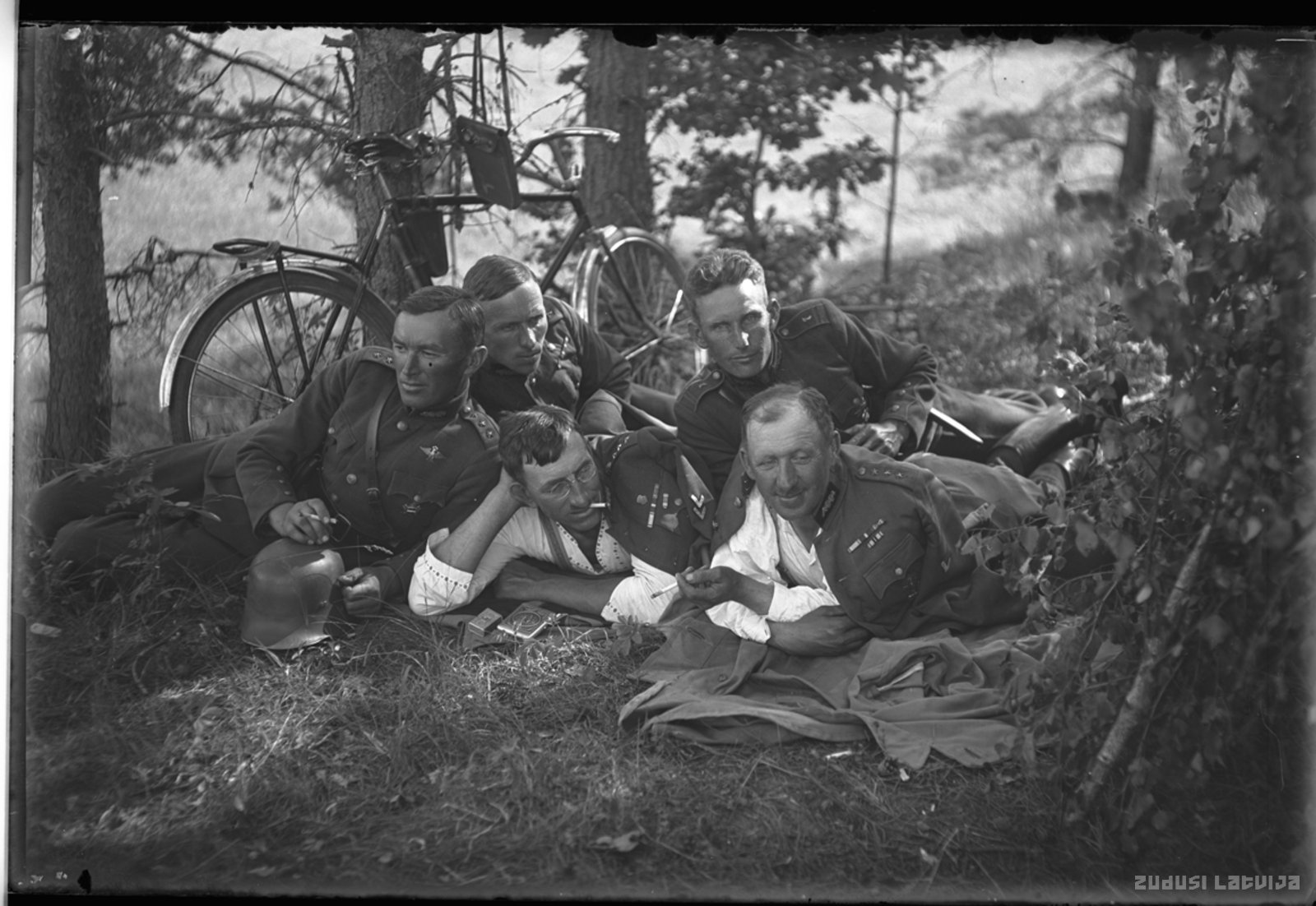 Vīriešu grupa brīvdabā armijas formas tērpos