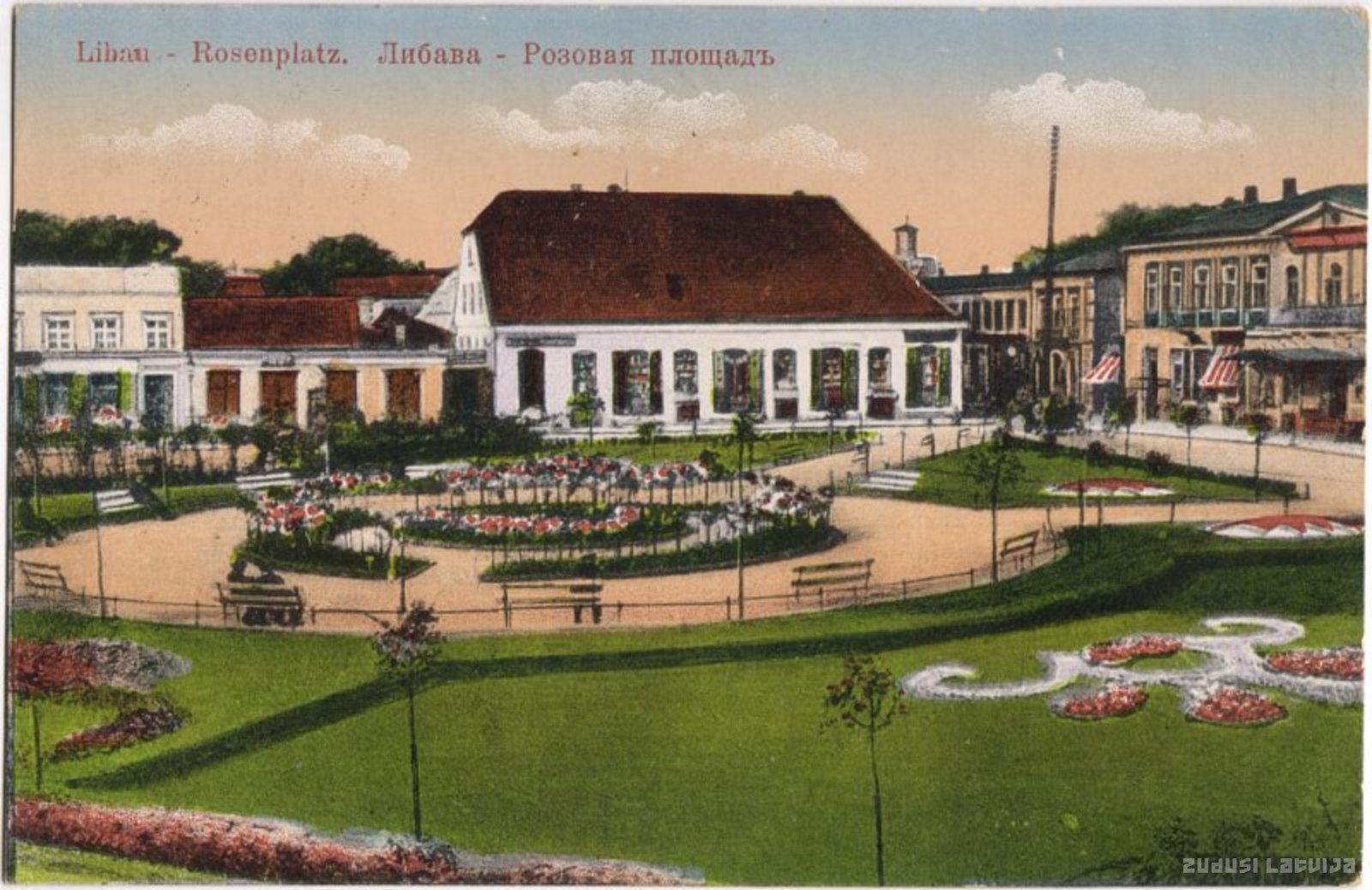 Liepājas Rožu laukums. Laukums savu nosaukumu un funkcijas laika gaitā ir mainījis vairākkārt. Jau 1797. gada Liepājas plānā šis laukums ir nosaukts kā Neue Markt jeb latviski Jaunais tirgus, kas tur ir pastāvējis no 17. gadsimta beigām. Taču 1910. gadā pilsētas varasvīri šeit nolēma izveidot atklātu dārzu ar rozēm un tika iestādīti ap 500 rožu stādu, bet tirgus tiek pārcelts uz pārbūvēto Pētera tirgus laukumu. 1911. gadā laukums nosaukts par Rožu laukumu un kļuva par Liepājas sirdi. 1945. gadā laukums tika pārdēvēts par Uzvaras laukumu, bet no 1988. gada tas atkal ir atguvis Rožu laukuma nosaukumu. Pie Rožu laukuma atrodas arī Latviešu Biedrības ēka (saukta arī par 15.maija namu), taču krietnu daļu savas apbūves laukums ir zaudējis Otrā pasaules kara gados - tajā skaitā arī attēlā redzamās ēkas. Centrā redzamās mazstāvu ēku grupas vietā tagad ir tirdzniecības nams. Ēkas pa labi Otrā pasaules kaŗa laikā tika sagrautas. 1999. gadā pašvaldība A. Kokina vadībā pasūtīja Rožu laukuma rekonstrukcijas un attīstības koncepciju. Pirmā rekonstrukcijas kārta jau īstenota, un ap Rožu laukuma centrālo rundāli virknējas Liepājas sadraudzības pilsētu ģerboņi. Arī pats rundālis ir pārveidots - kā paugurs ar rožu stādījumiem centrā. Rožu laukuma rekonstrukcija ir saistīta ar plānoto Zivju ielas pārveidi par kājāmgājēju ielu. (Grupa Līvi savulaik par Liepājas Rožu laukumu sacerēja dziesmu, kuru tā arī sauc - "Rožu laukums".)