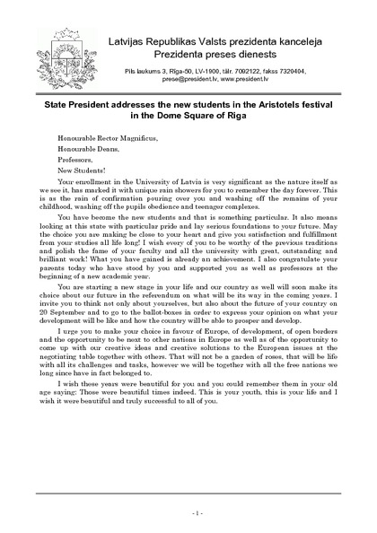 State President addresses the new students in the Aristotels festival in the Dome Square of Riga