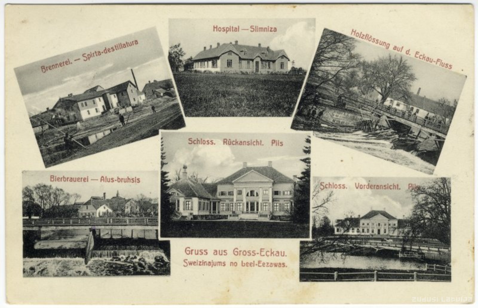 Fotokolāžā - Iecavas muižas pils, alus, spirta brūzis, slimnīca, koka tilts