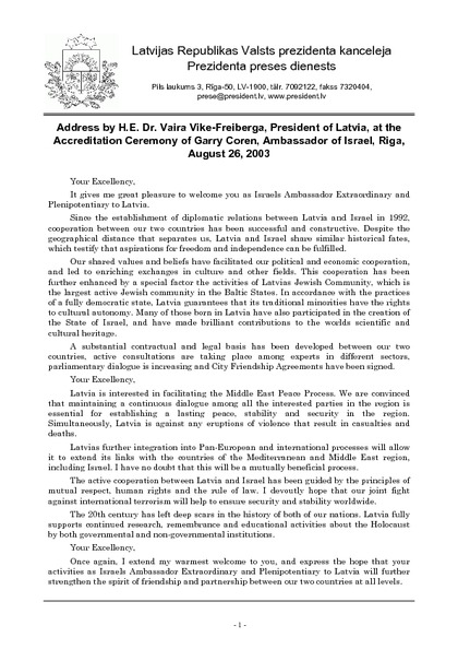Address by H.E. Dr. Vaira Vike-Freiberga, President of Latvia, at the Accreditation Ceremony of Garry Coren, Ambassador of Israel, Riga, August 26, 2003