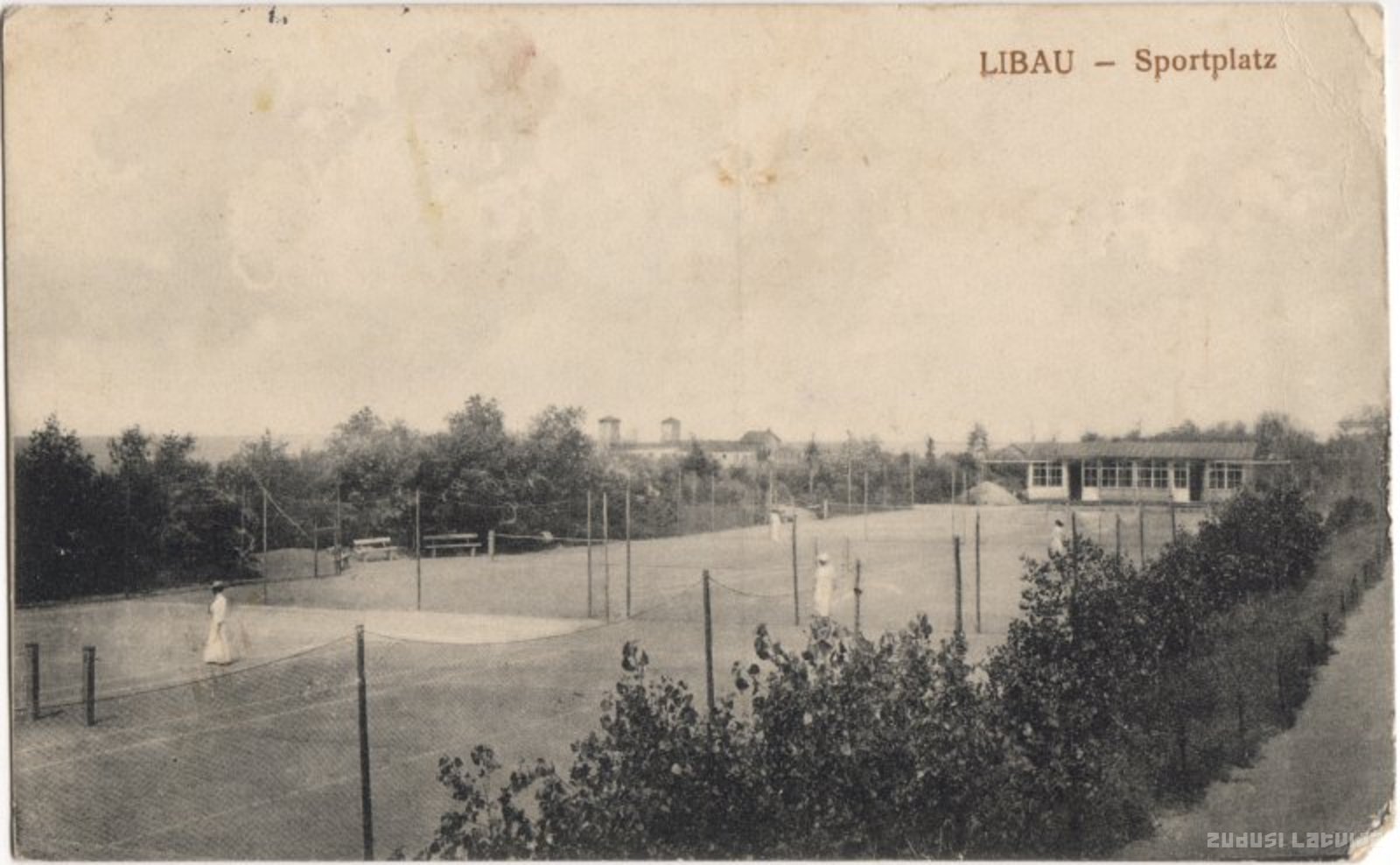 Liepāja, sporta laukums Jūrmalas parkā 20. gadsimta sākumā. 1895. gadā Liepājas pilsētas valde pieņēma lēmumu izveidot parku starp Peldu un Krasta (tag. Liepu) ielām pēc Rīgas galvenā dārznieka G. Kufalta (Kuphaldt) projekta. Līdz 1906. gadam turpinājās grūts darbs - bija jāuzved auglīgā zeme un jāsagādā stādāmie koki un krūmi. Apstādījumos tika izvietoti vairāki tenisa laukumi, bet parka dienvidu daļā - sporta laukums. Liepājas Jūrmalas parks bija Latvijā lielākais - tas stiepās 3 km gar Liepājas pludmali (šobrīd tas aizņem 70 ha un ir uzskatāms par vienu no lielākajiem Latvijā). Mūsdienās parks ir ieguvis vietējas nozīmes dendroloģiska stādījuma statusu