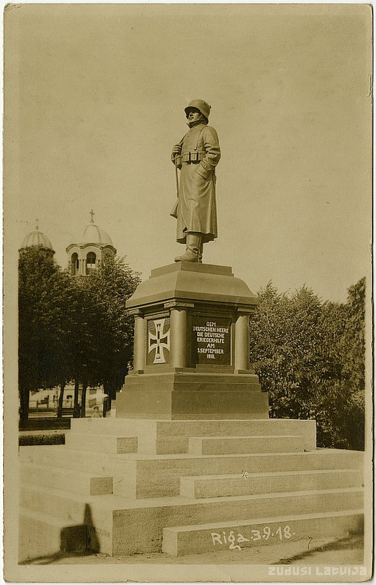 Vācu okupācijas laikā 1918. gada nogalē tagadējā Baumaņa skvērā atradās piemineklis vācu kareivjiem - uz postamenta novietota koka skulptūra, oficiāli saukta "Dzelzs zemessargs", tautā dēvēta par "Koka Frici". 1919. gada janvārī, kad lielinieki ienāca Rīgā, pieminekli demontēja