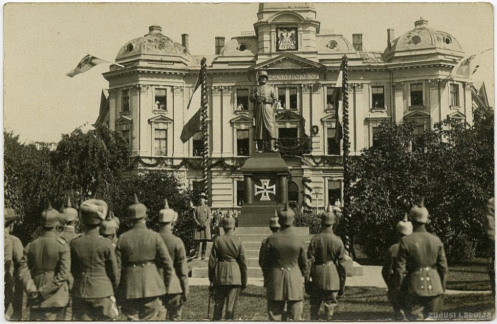 Vācu okupācijas laikā 1918. gada nogalē tagadējā Baumaņa skvērā atradās piemineklis vācu kareivjiem - uz postamenta novietota koka skulptūra, oficiāli saukta "Dzelzs zemessargs", tautā dēvēta par "Koka Frici". 1919. gada janvārī, kad lielinieki ienāca Rīgā, pieminekli demontēja