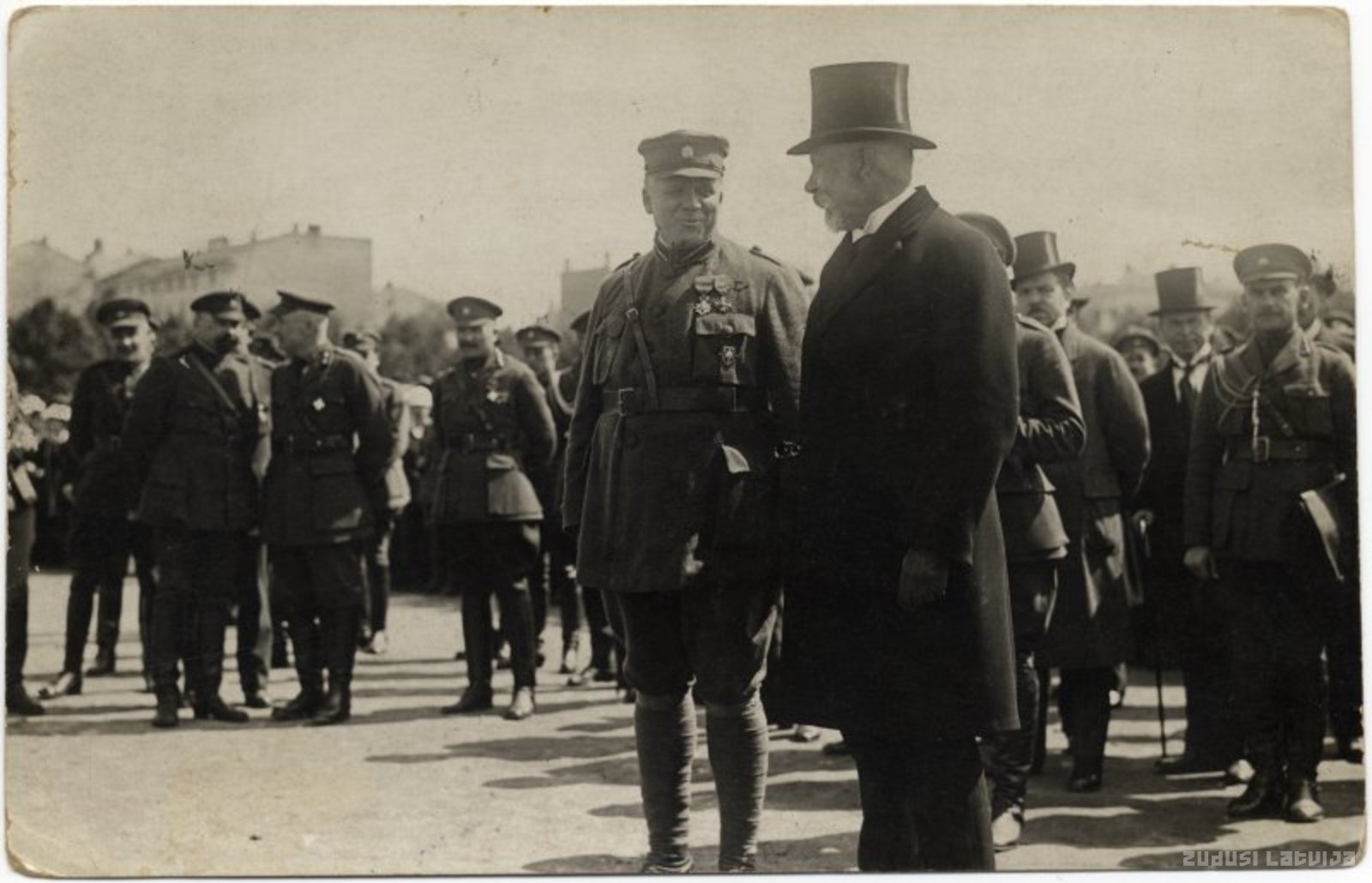 J. Čakste un K. Ulmanis armijas parādes laikā Rīgā 1920. gadā