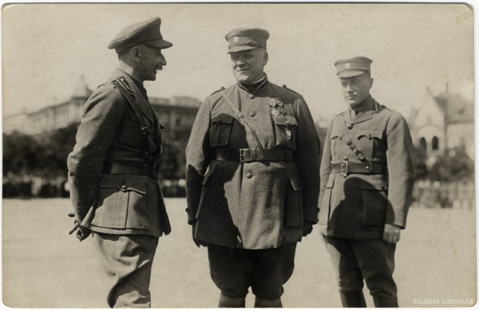 Attēlā no kreisās: armijas virspavēlnieka štāba priekšnieks ģenerālis Pērteris Radziņš, ministru prezidents un apsardzības ministrs Kārlis Ulmanis, armijas virspavēlnieks ģenerālis Jānis Balodis