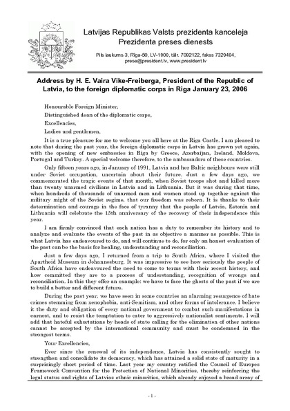 Address by H. E. Vaira Vike-Freiberga, President of the Republic of Latvia, to the foreign diplomatic corps in Riga January 23, 2006