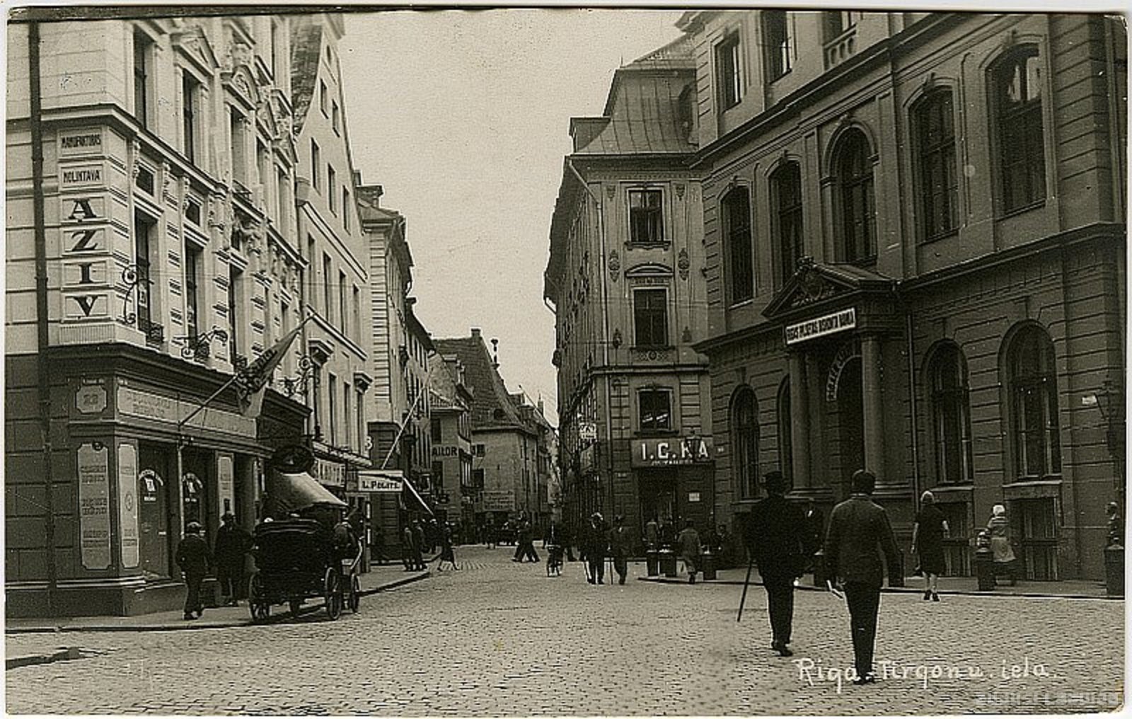 Tirgoņu ielas gals pie Krāmu ielas, attēla kreisajā pusē nams Lielajā Jaunavu ielā 1. Tirgoņu iela minēta kopš 14. gadsimta 30. gadiem (platea mercatorum, vēlāk de kopstrate, Kaufstrasse). Jau viduslaikos tā bijusi nozīmīga tirdzniecības iela. Tās nozīme īpaši pieauga pēc pilsētas tirgus pārcelšanas uz jauno Tirgus laukumu - vēlāko Rātslaukumu, kad Tirgoņu iela, kā Lielās Smilšu ielas turpinājums (Tirgoņu iela tolaik iekļāva arī Šķūņu ielas posmu līdz Zirgu ielai), savienoja tirgu ar galveno ieeju pilsētā
