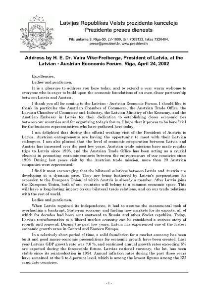 Address by H. E. Dr. Vaira Vike-Freiberga, President of Latvia, at the Latvian - Austrian Economic Forum, Riga, April 24, 2002