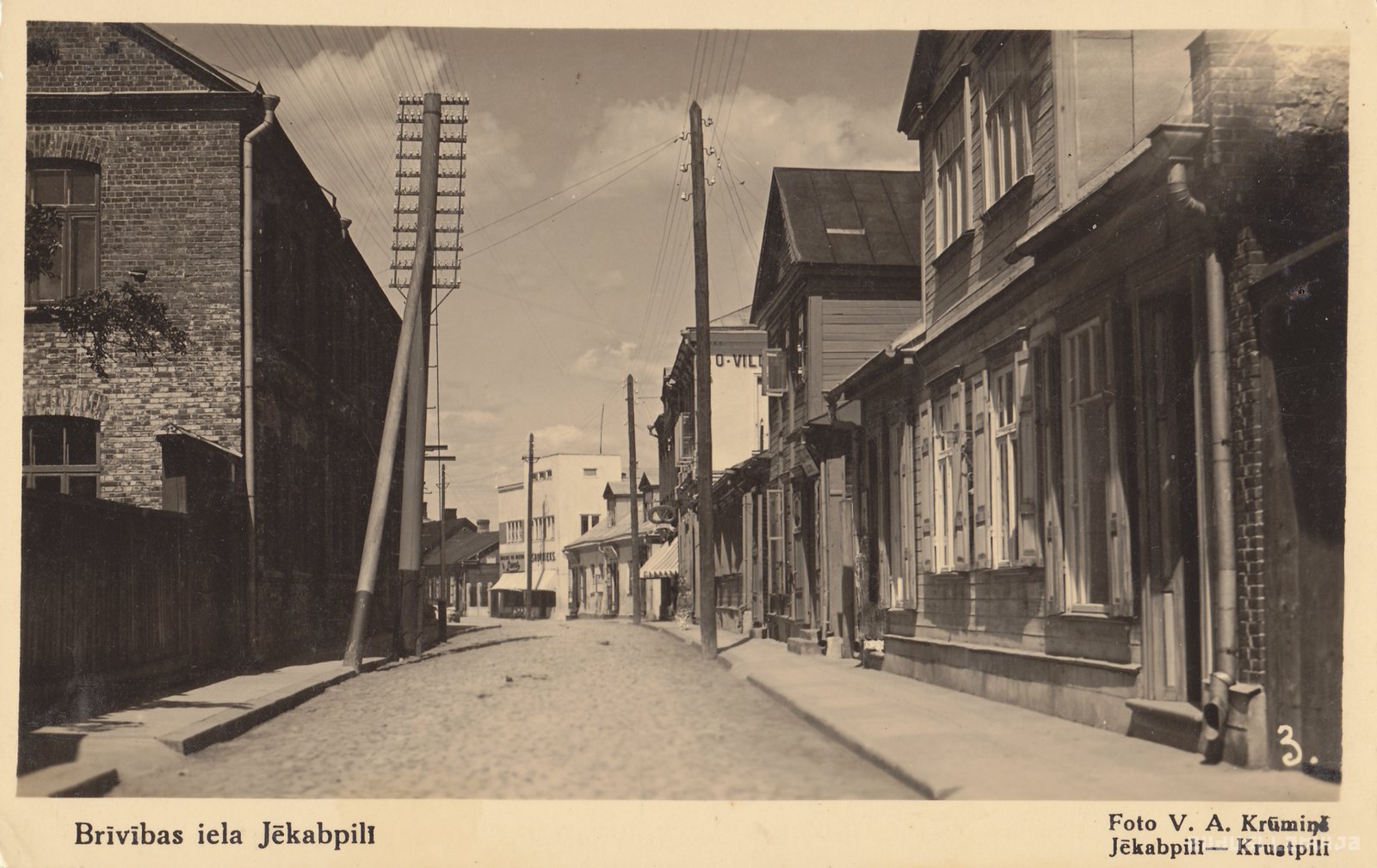 Atklātnes kreisajā pusē redzama latviešu pamatskola, apbūve labajā pusē līdz baltajam divstāvu namam nav saglabājusies, jo tika nojaukta pēc 1981. gada plūdiem. Baltais divstāvu nams ar saredzamajiem burtiem O.Vil bija O. Vildes desu un gaļas veikals, bet pagalmā desu rūpnīca, aiz desu veikala atradās Vildes dēla kafejnīca. Divstāvu baltajā namā atklātnes dziļumā konfekšu veikals "Laima", V.Šņornieka grāmatu veikals, bet otrajā stāvā foto salons "Aina"