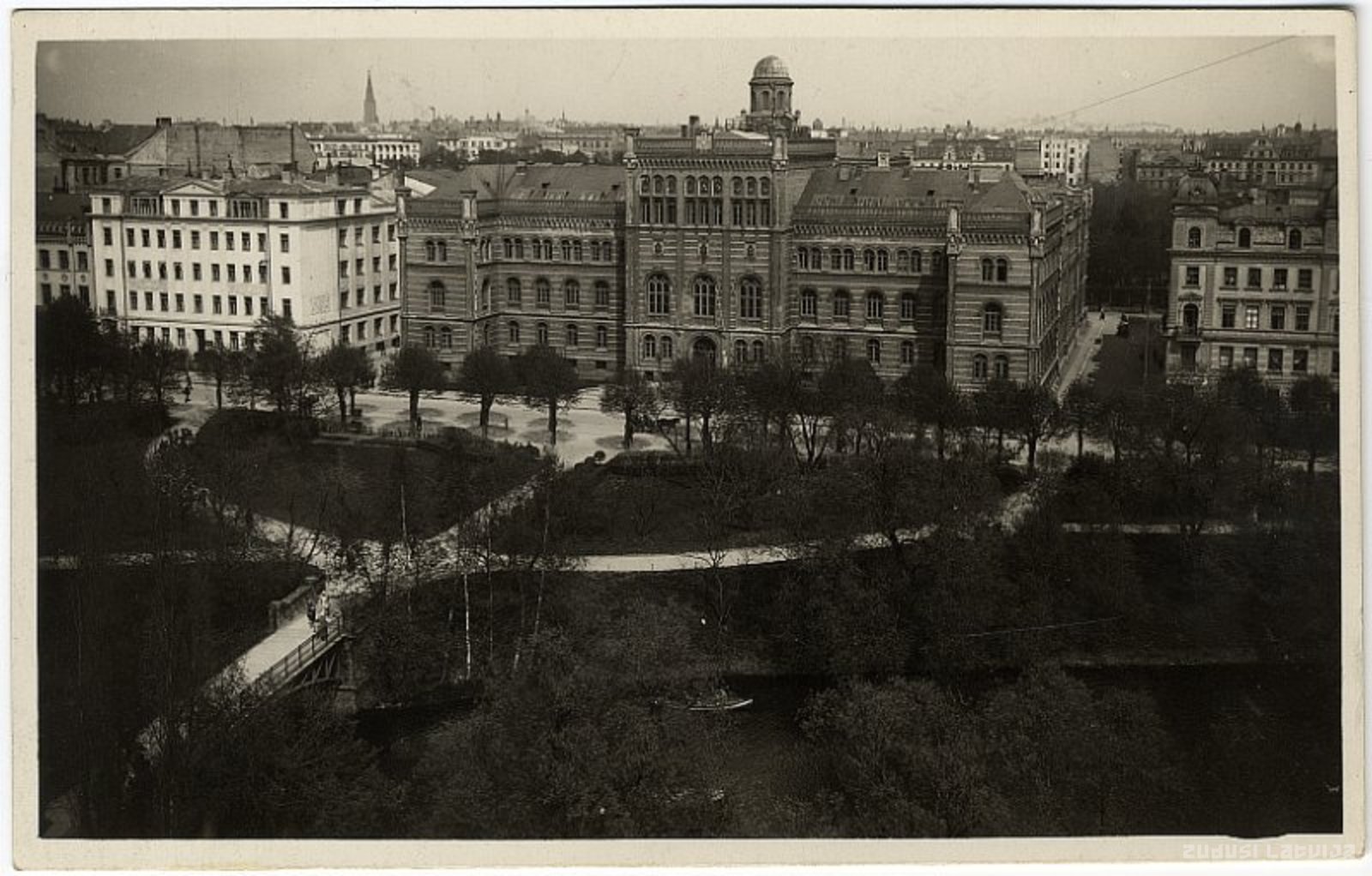 Rīgas Politehnikuma ēkas daļa gar Raiņa bulvāri celta 1866.–1869. gadā pēc arhitekta G. F. A. Hilbiga projekta. Fasādē agrākā Rīgas Politehnikuma fakultāšu simbolika un kādreizējo Baltijas guberņu (Vidzemes, Kurzemes, Igaunijas) un Sāmsalas ģerboņi cinka lējuma ciļņos. Rīgas Politehnikums dibināts 1862. gadā, sākotnēji tas darbojās ēkā Krišjāņa Barona ielā 14, no 1869. gada jaunajā ēkā Raiņa bulvārī. 1896.–1915. gadā augstskolas nosaukums - Rīgas Politehniskais institūts. Līdz 1896. gadam mācības notika vācu valodā, vēlāk, līdz 1. pasaules karam – krievu valodā. No 1919. gada ēkā darbojās Latvijas Augstskola (dibināta 1919. gadā), no 1923. gada tās nosaukums Latvijas Universitāte, 2. pasaules kara vācu okupācijas laikā ar nosaukumu Universitāte Rīgā, padomju okupācijas gados Latvijas Valsts universitāte (1958. gadā nosaukta Pētera Stučkas vārdā). 20. un 30. gados ēka bija LU īpašums. Tajā laikā tur darbojās arī virkne biedrību, t. sk. Latvijas arhitektu biedrība, Latvijas teologu un filozofu biedrība, Kanta biedrība, Tautu savienības veicināšanas biedrība u. c. Tagad tā ir LU galvenā ēka