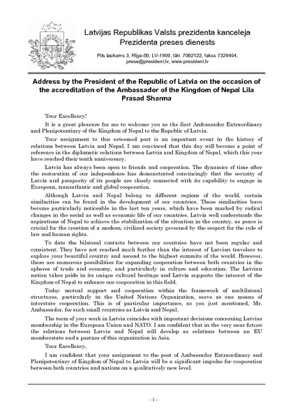 Address by the President of the Republic of Latvia on the occasion of the accreditation of the Ambassador of the Kingdom of Nepal Lila Prasad Sharma